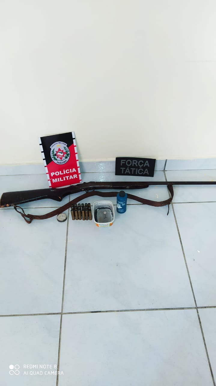 Ao chegar em sua residência, a guarnição adentrou a sala com a permissão de sua genitora, a qual uma documentação referente a moto, porém havia rasuras e adulteração no documento, ao tempo em que estava sendo analisada a documentação, policiais avistaram uma espingarda da marca ROSSI, calibre 36, com 18 cartuchos recarregados