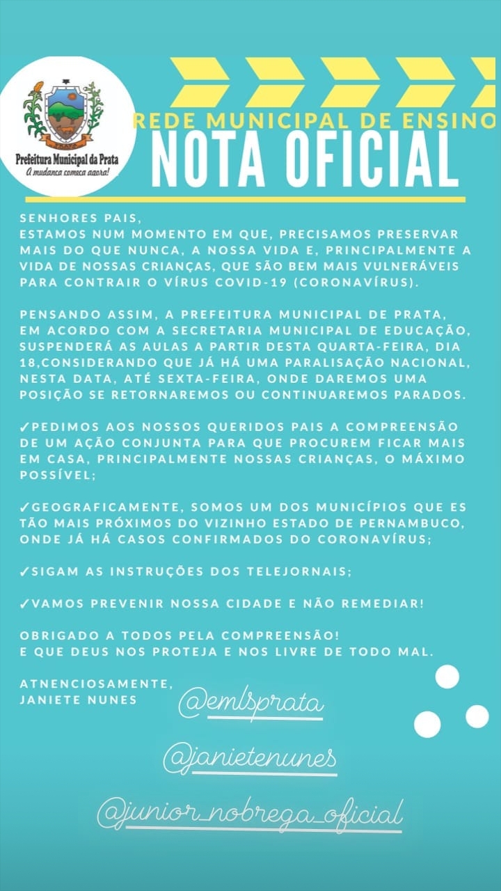 O Prefeito Municipal de Prata, Júnior Nóbrega, se reuniu com a Secretaria Municipal de Educação, Janiete Nunes e decidiu suspender as aulas da rede municipal de ensino, a partir desta terça feira dia 17 de março, para garantir a Saúde da população e evitar aglomerações que possam contribuir com a disseminação do novo Coronavírus(Covid-19).