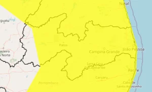 As demais regiões do estado, o que inclui a Grande João Pessoa, estão classificadas no alerta amarelo. A previsão é de chuvas entre 20 e 30 milímetros por hora e 50 milímetros por dia e também de ventos intensos entre 40 e 60 quilômetros por hora. Há baixo risco de queda de árvores, alagamentos e de descargas elétricas.