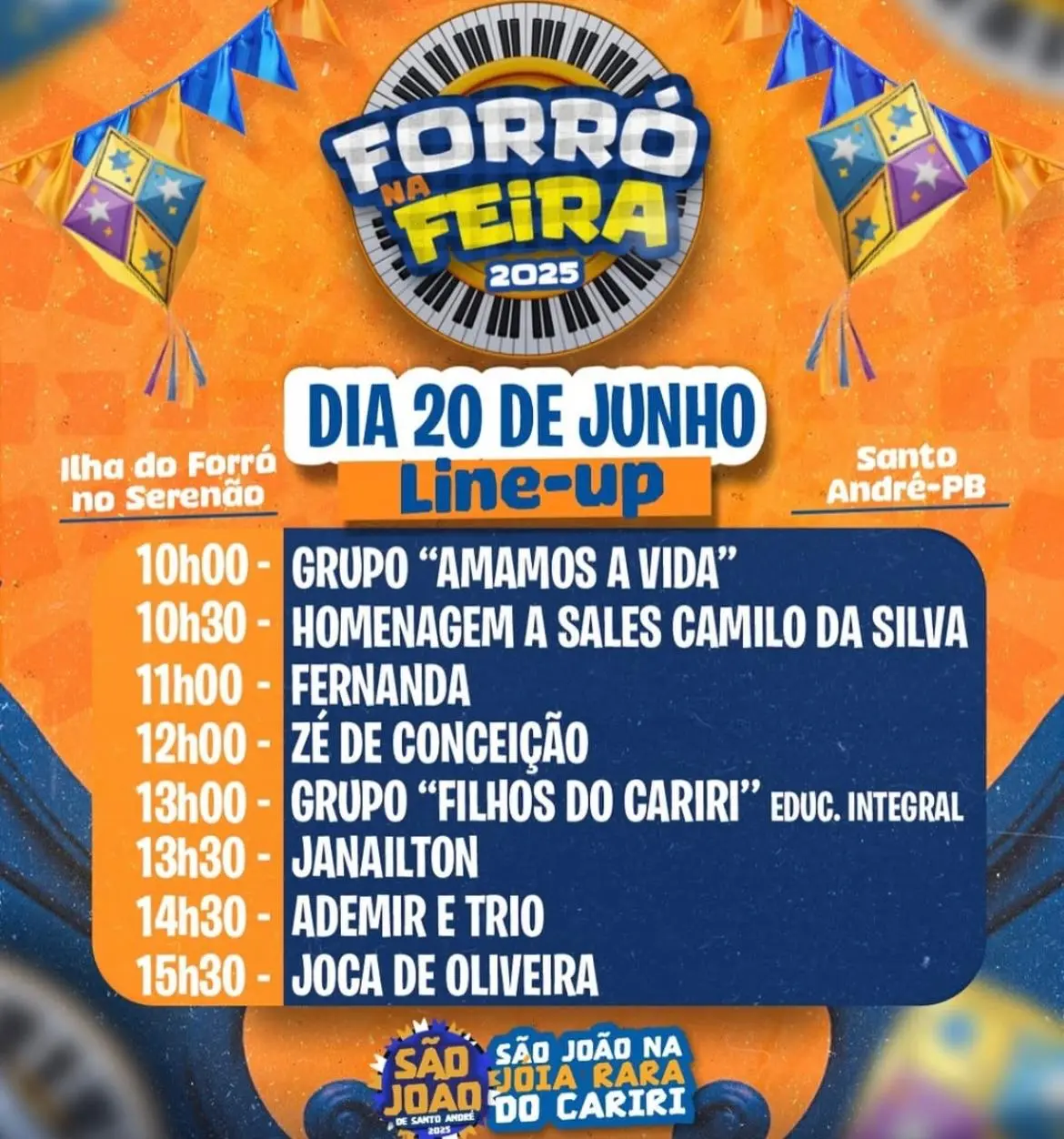 A Prefeitura de Santo André, no Cariri paraibano, divulgou nesta quarta-feira (18) a programação oficial do Forró na Feira 2025, evento tradicional que será realizado nesta sexta-feira, 20 de junho, no espaço do Serenão, também conhecido como Ilha do Forró.