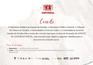 Na próxima terça-feira, dia 1º de julho, o município de Monteiro, no Cariri paraibano, será sede de um importante curso de formação voltado à capacitação cidadã: o curso de Agente de Controle Social, que ocorrerá a partir das 9h, no Auditório da Câmara de Vereadores.