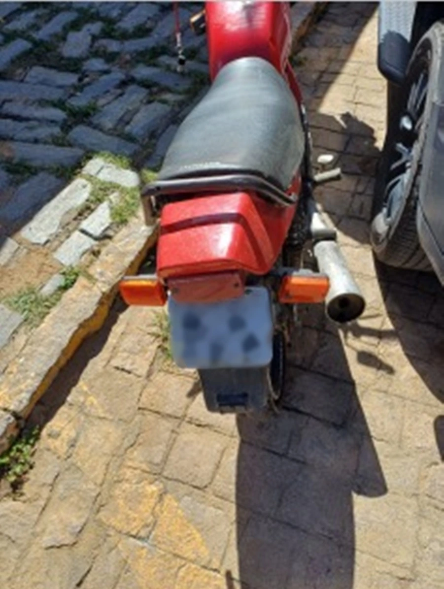 Questionado, o jovem informou não possuir a documentação da motocicleta. Após inspeção detalhada, foram encontrados indícios visíveis de adulteração nos sinais identificadores do veículo, configurando situação análoga ao crime do art. 311 do Código Penal.