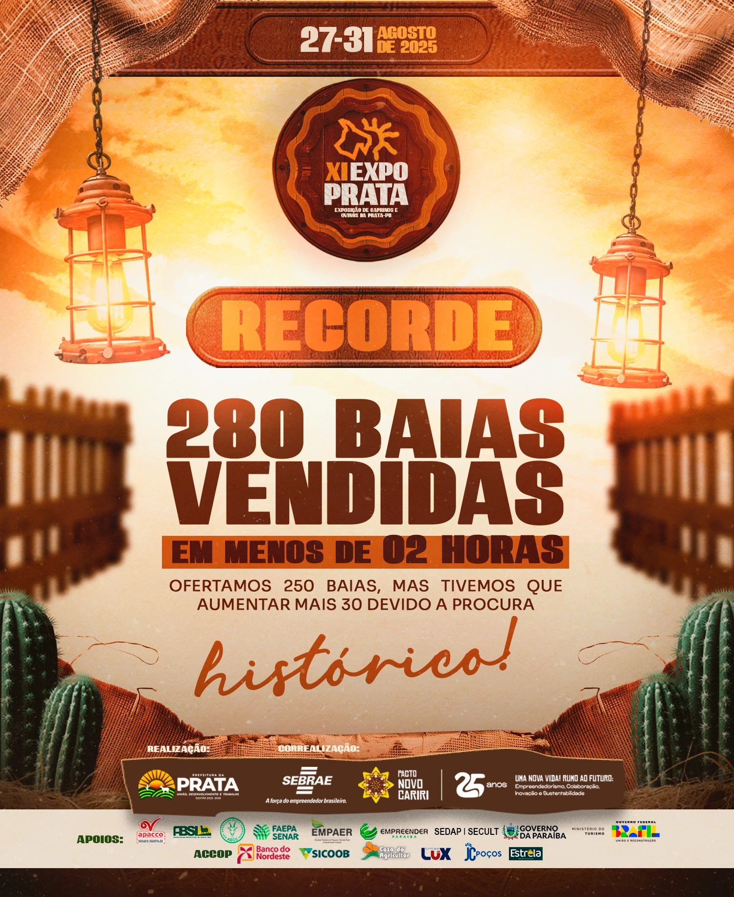 A XI edição da EXPOPRATA – Exposição de Caprinos e Ovinos da cidade de Prata, no Cariri paraibano – registrou um feito inédito na história do evento. Em menos de duas horas, 280 baias foram comercializadas, superando a oferta inicial de 250 e obrigando a organização a ampliar a estrutura diante da alta demanda.