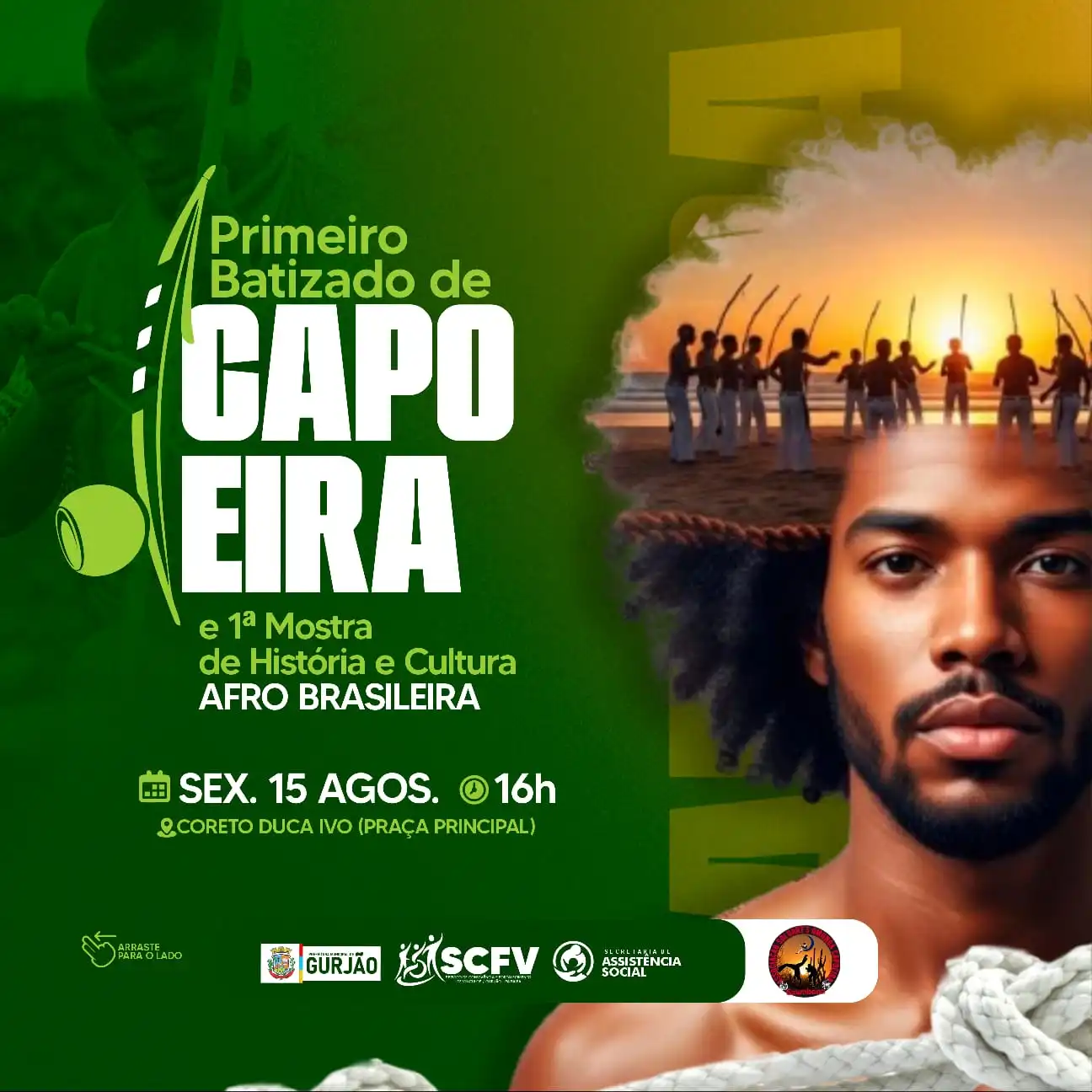 A Prefeitura de Gurjão, por meio da Secretaria de Assistência Social e do Serviço de Convivência e Fortalecimento de Vínculos (SCFV), realiza nesta sexta-feira, 15 de agosto, a partir das 16h, no Coreto Duca Ivo (Praça Principal), o 1º Batizado de Capoeira e a 1ª Mostra de História e Cultura Afro-Brasileira.