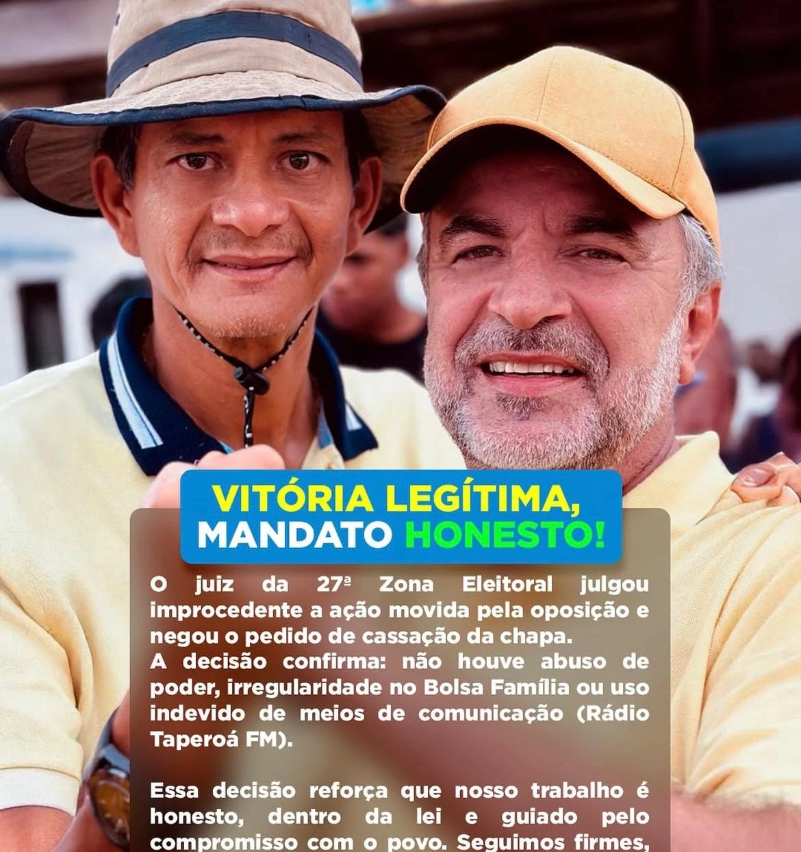 “Essa decisão reforça que nosso trabalho é honesto, dentro da lei e guiado pelo compromisso com o povo. Seguimos firmes, de cabeça erguida, focados em fazer Taperoá avançar cada vez mais, com obras, serviços e políticas que melhorem a vida de cada cidadão e cidadã do nosso município”, destacou.