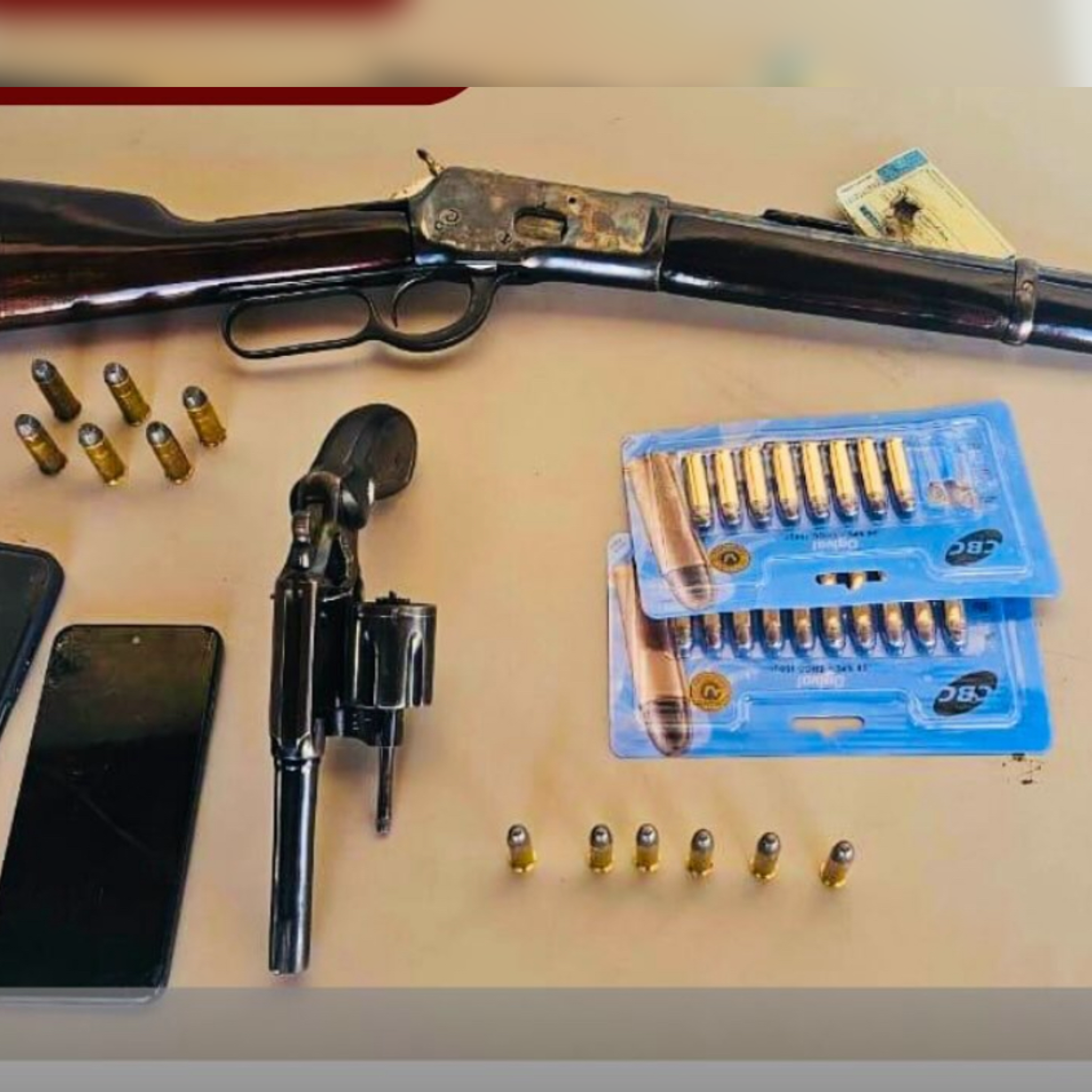 Durante rondas na região, a equipe realizou uma abordagem a suspeitos e encontrou um revólver e um rifle, ambos municiados, além de 18 munições calibre 38.