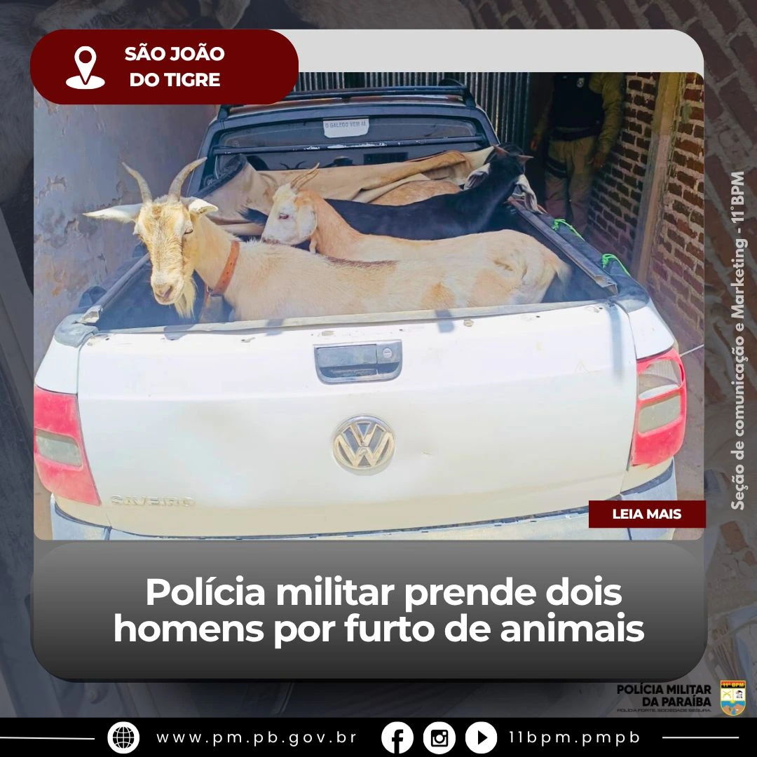 Nesta sexta-feira, 31 de outubro, policiais militares do 11º Batalhão realizavam rondas na zona rural do distrito de Cacimbinha, município de São João do Tigre, quando efetuaram a prisão de dois homens pelo crime de abigeato (furto de animais).