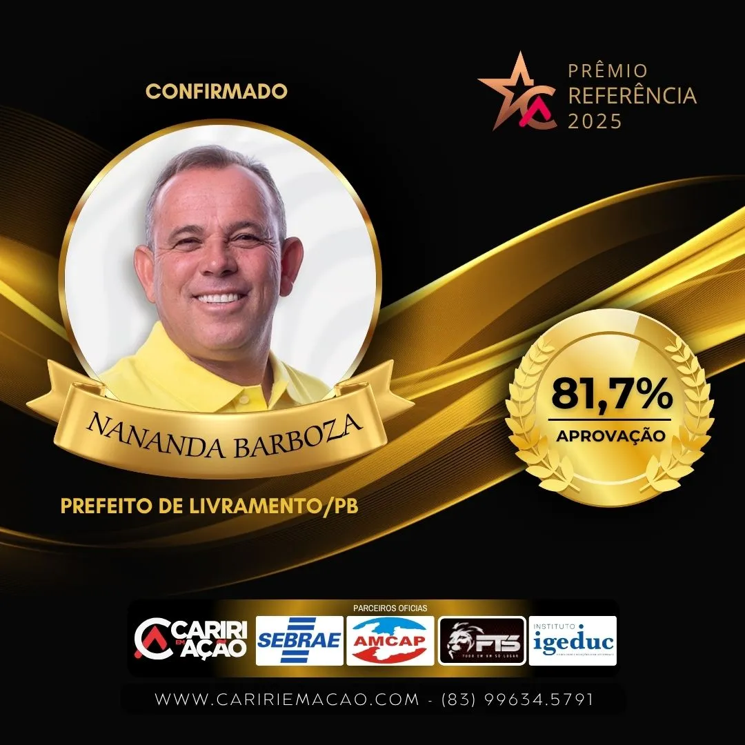 O Prêmio Referência 2025, promovido pelo Portal Cariri em Ação, celebra profissionais, gestores e instituições que se destacam pela contribuição ao desenvolvimento do Cariri Paraibano e do Sertão Pernambucano. A cerimônia reunirá autoridades, empresários e lideranças regionais, em uma noite de celebração e valorização da nossa gente.