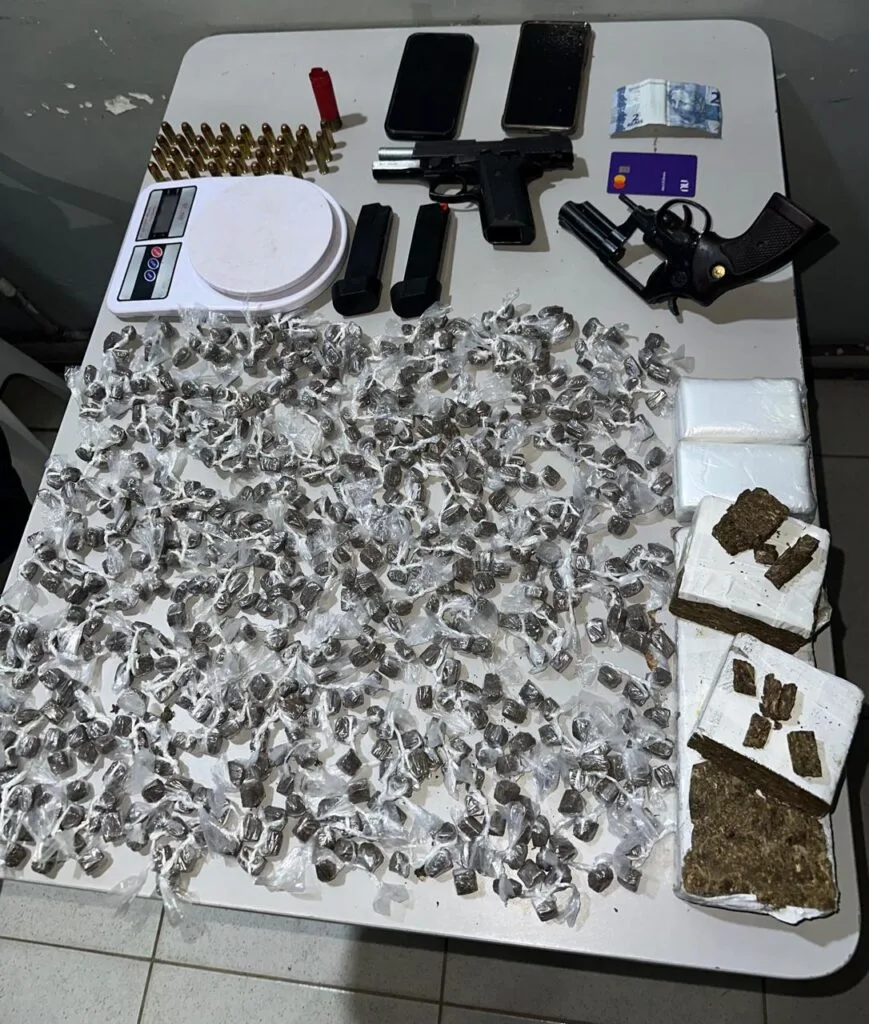 Durante a atuação policial, foram localizadas e apreendidas armas de fogo, munições, entorpecentes e diversos materiais, os quais foram devidamente apresentados à autoridade policial competente para as providências legais cabíveis.