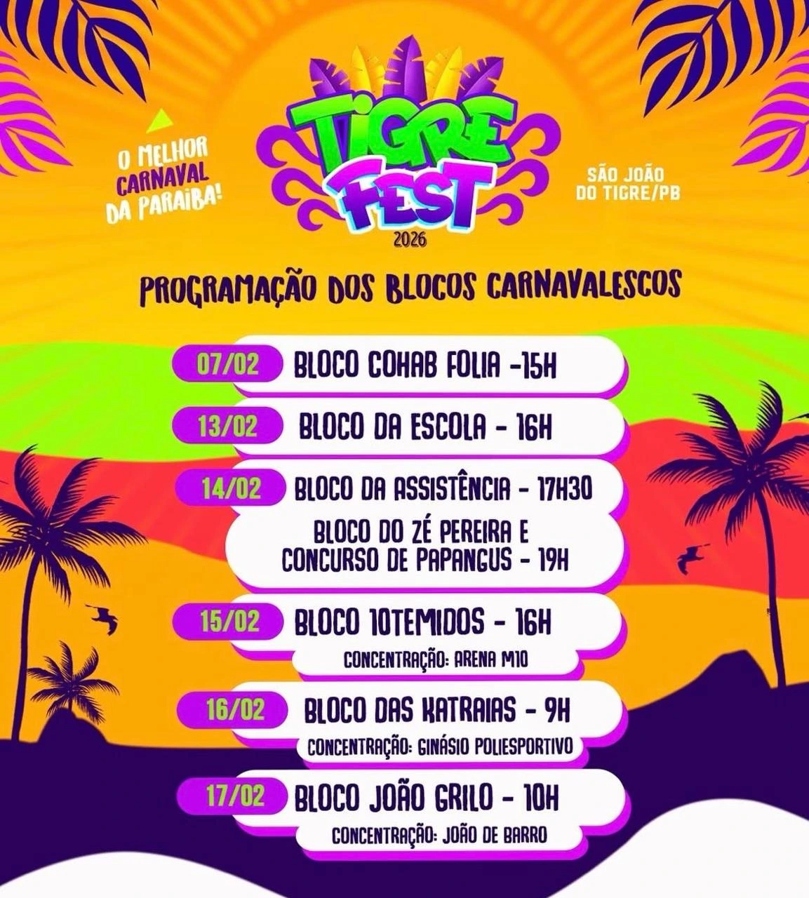 A Prefeitura de São João do Tigre divulgou a programação oficial dos blocos carnavalescos do Tigre Fest 2026. O calendário reúne datas, horários e locais de concentração das agremiações que irão animar as ruas do município durante o período festivo.
