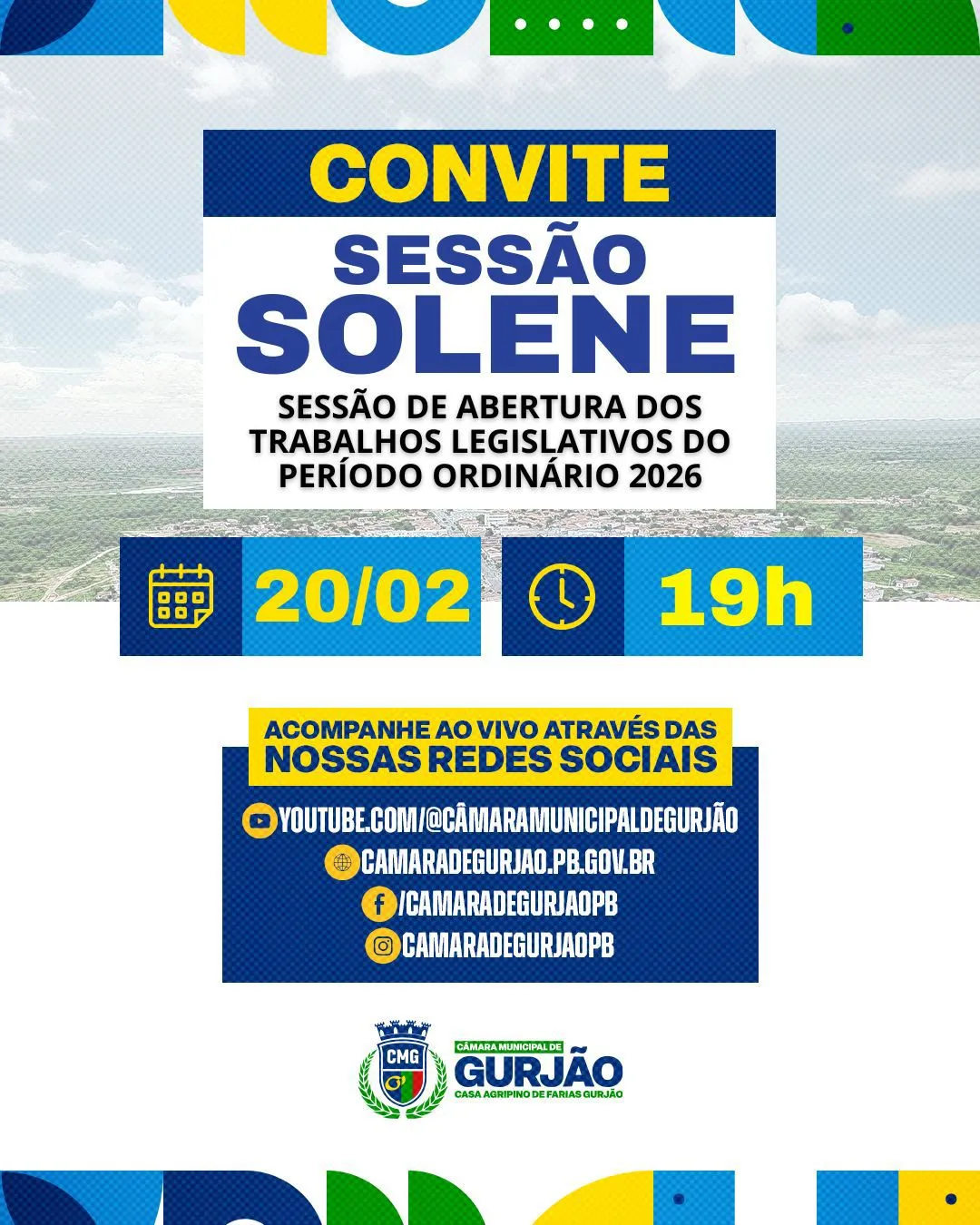 A Câmara Municipal de Gurjão realizará, no próximo dia 20 de fevereiro, a Sessão de Abertura do Período Ordinário dos Trabalhos Legislativos. A solenidade acontecerá às 18h30, no Plenário da Casa Agripino de Farias, marcando o início oficial das atividades parlamentares no município em 2026.