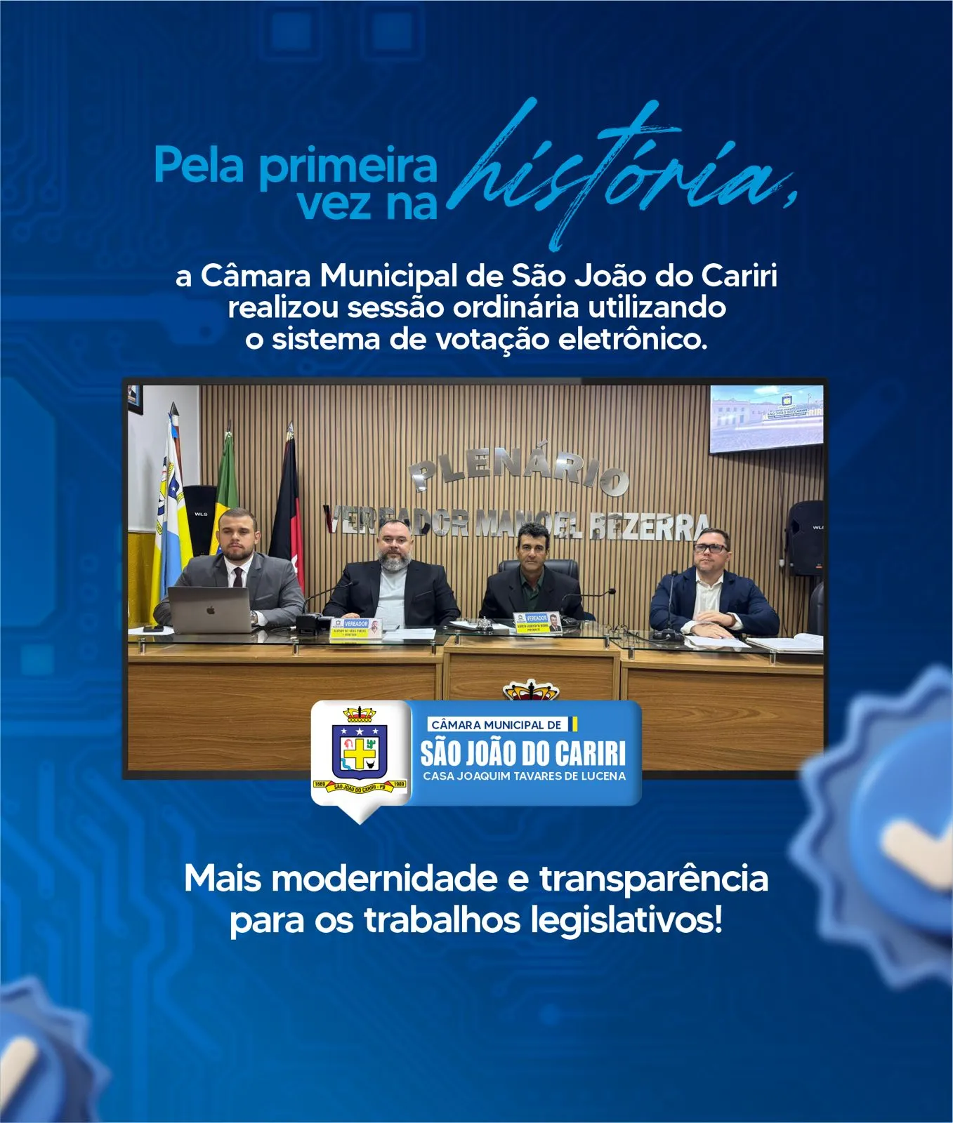Com a implantação do novo sistema, a Câmara Municipal de São João do Cariri passa a contar com mais um instrumento tecnológico que contribui para tornar os trabalhos legislativos mais eficientes e acessíveis à população.