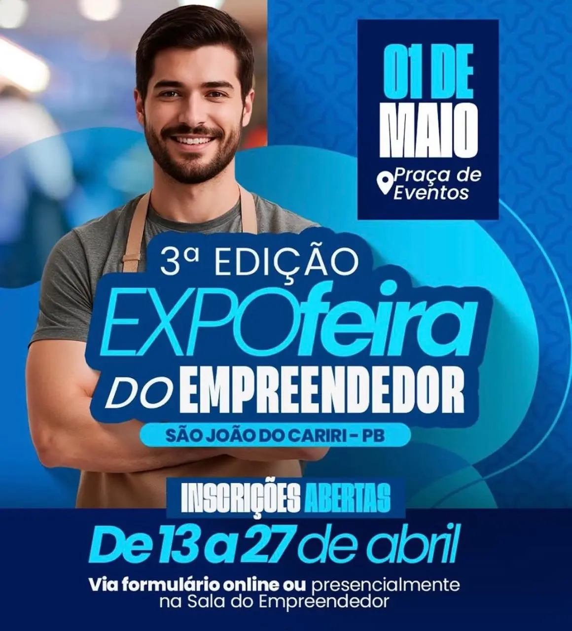 A Prefeitura de São João do Cariri vai promover, no próximo dia 1º de maio, a 3ª edição da Expofeira do Empreendedor. O evento será realizado na Praça de Eventos do município e integra a programação comemorativa pelo aniversário da cidade.