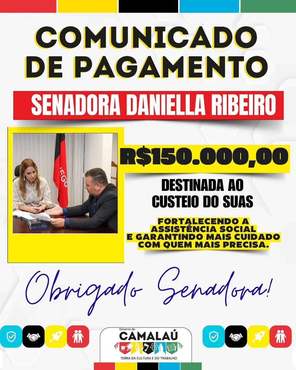 O município de Camalaú conquistou um importante reforço para as políticas públicas de assistência social. Foi confirmado o pagamento de uma emenda parlamentar no valor de R$ 150 mil, destinada pela senadora Daniella Ribeiro, recurso que será aplicado no custeio das ações do Sistema Único de Assistência Social (SUAS).