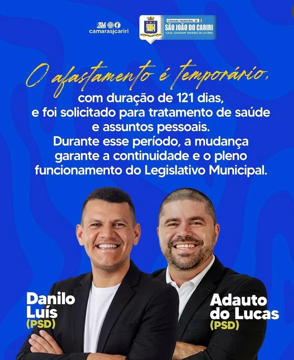 A Câmara Municipal de São João do Cariri, Casa Joaquim Tavares de Lucena, oficializou a licença temporária do vereador Danilo Luís, que se afastou de suas funções parlamentares por um período determinado. Em seu lugar, assumiu de forma interina, na última segunda-feira, o suplente Adauto Silva, conhecido como Adauto do Lucas, pelo prazo de 121 dias.