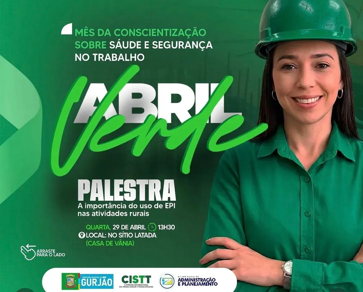 A Prefeitura de Gurjão, em parceria com a Comissão Intersetorial de Saúde do Trabalhador e da Trabalhadora (CISTT), realiza no próximo dia 29 de abril uma programação especial em alusão ao Abril Verde, campanha dedicada à conscientização sobre a importância da saúde e segurança no ambiente de trabalho.