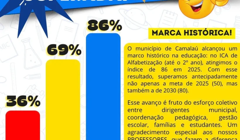 Camalaú alcança 86% no indicador de alfabetização e supera meta prevista para 2030Parari supera meta de alfabetização e alcança 100% em 2025